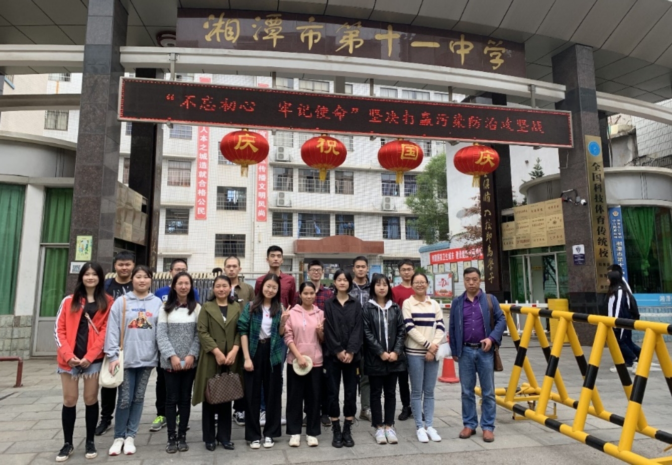 2016级教育技术学一班12位同学在湘潭市二中校园合影留念