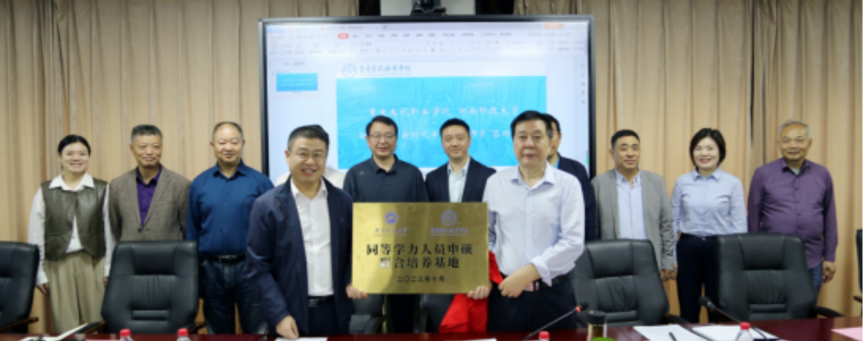 我校继续教育学院院长曾治国与重庆电讯职业学院院长栗玉侠为“同等学力人员申硕”联合培养基地揭牌。