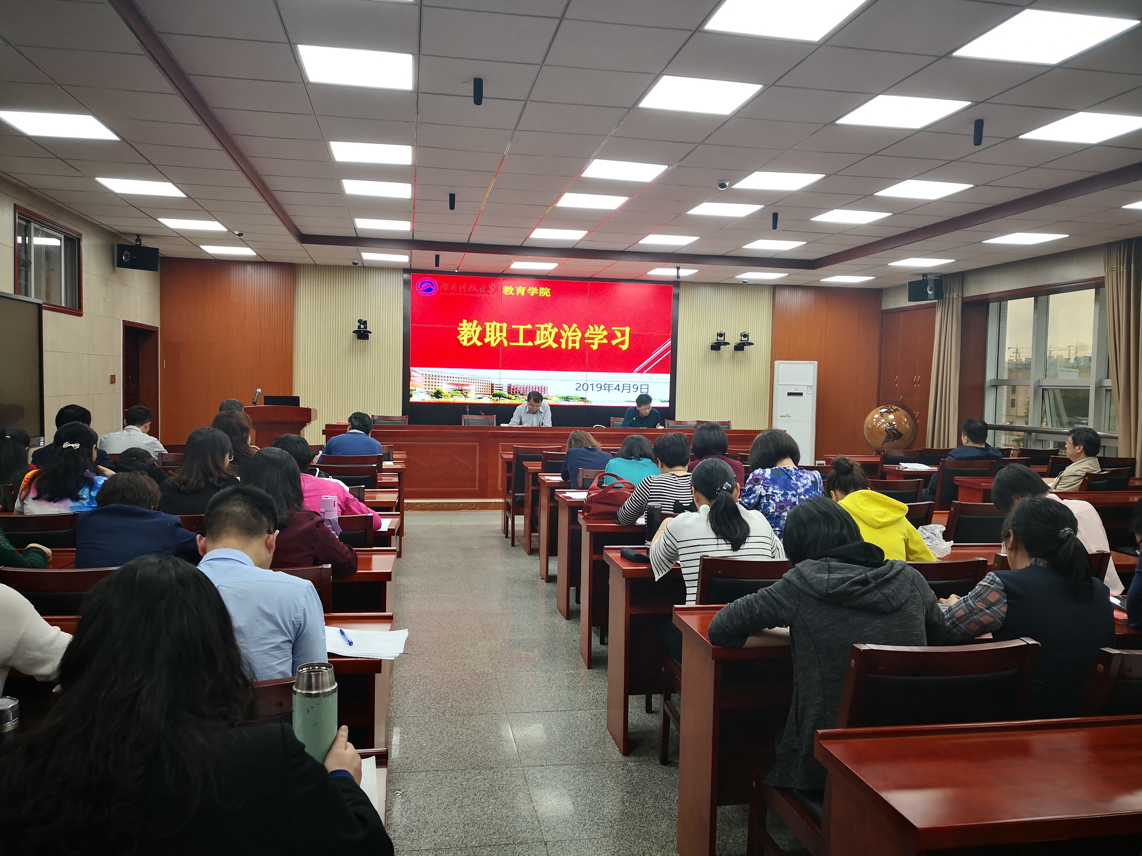 2019年4月9日下午,教育学院组织全体教职工在第八教学楼308会议室学习省教育厅党组书记、厅长、省委教育工委书记蒋昌忠,省纪委常委黄立峰,省纪委省监委驻省教育厅纪检监察组组长曹世凯三位领导同志在2019年全省教育系统全面从严治党工作视频会议上的讲话精神。会议由院党委书记李炳煌主持。