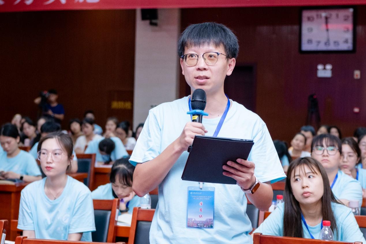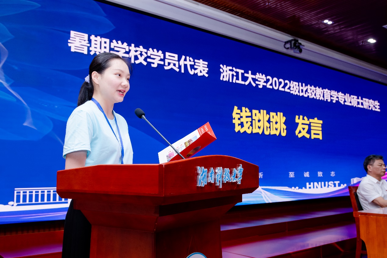 浙江大学2022级比较教育学专业硕士研究生钱跳跳同学作为学员代表发言。她首先对各位领导和老师为举办研究生暑期学校付出的辛勤劳动表示感谢。她表示,一定满怀学习热情、珍惜学习机会,结识更多良师益友;拓宽学术视野、提升学科素养,努力提升研究能力,在湖科大度过一段充实而又难忘的暑期时光。
